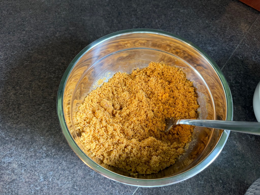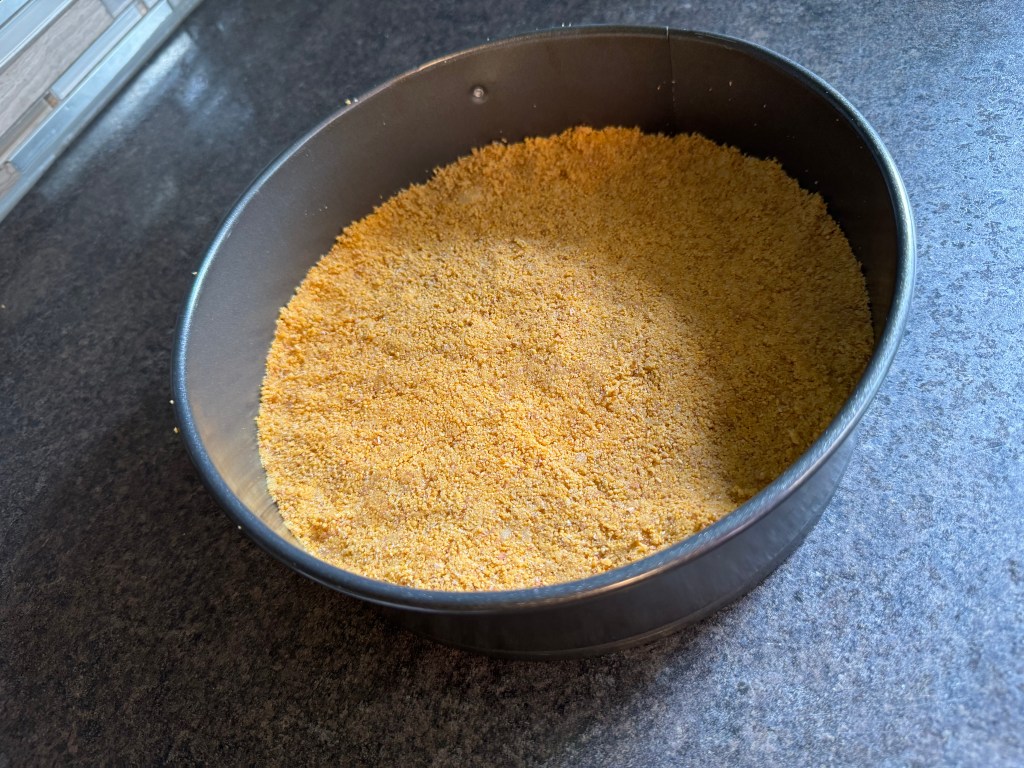 - Press the graham cracker mixture into the spring form pan, creating a thick, even layer across the bottom of the pan. Lightly pack down the crumbs so that the crust holds together. Some people use the bottom of a bowl or a cup to press it down, or you can use your hands as well. Set aside.