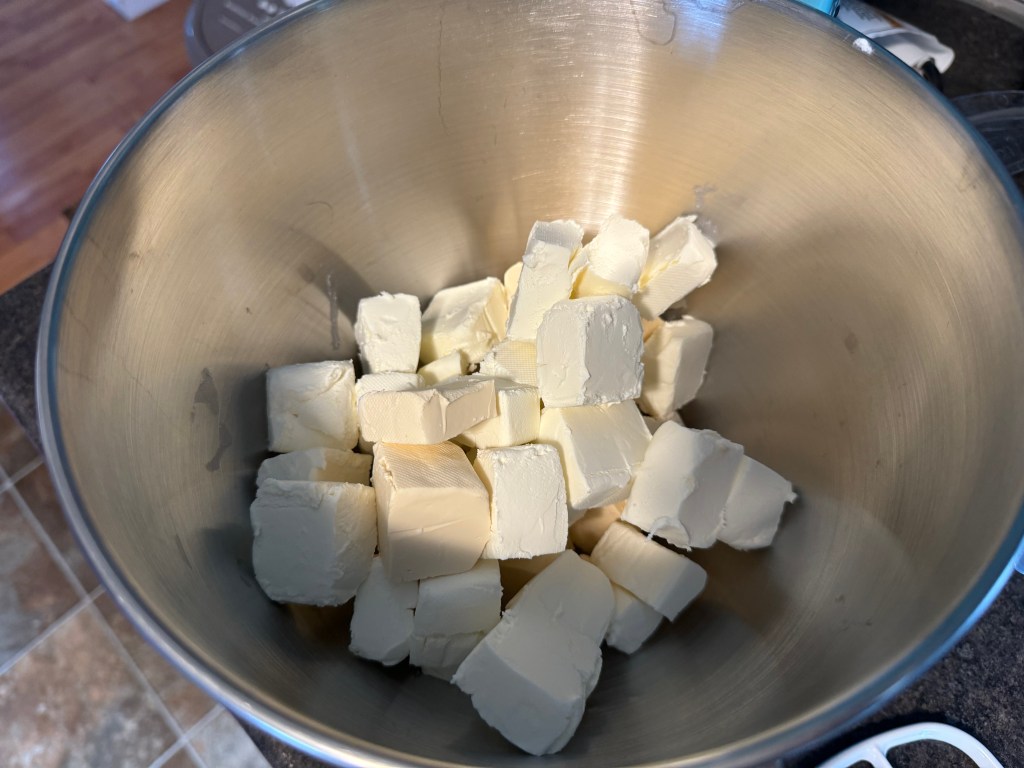 - In a medium mixing bowl, beat the cream cheese with a hand mixer (or standing mixer) until light and fluffy. This is important to ensure that your cheesecake does not become lumpy. I like to cut the cream cheese into cubes to make it easier.