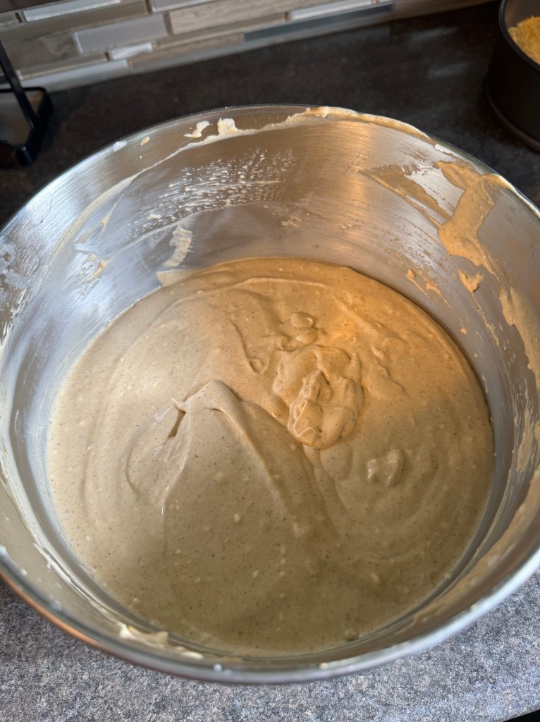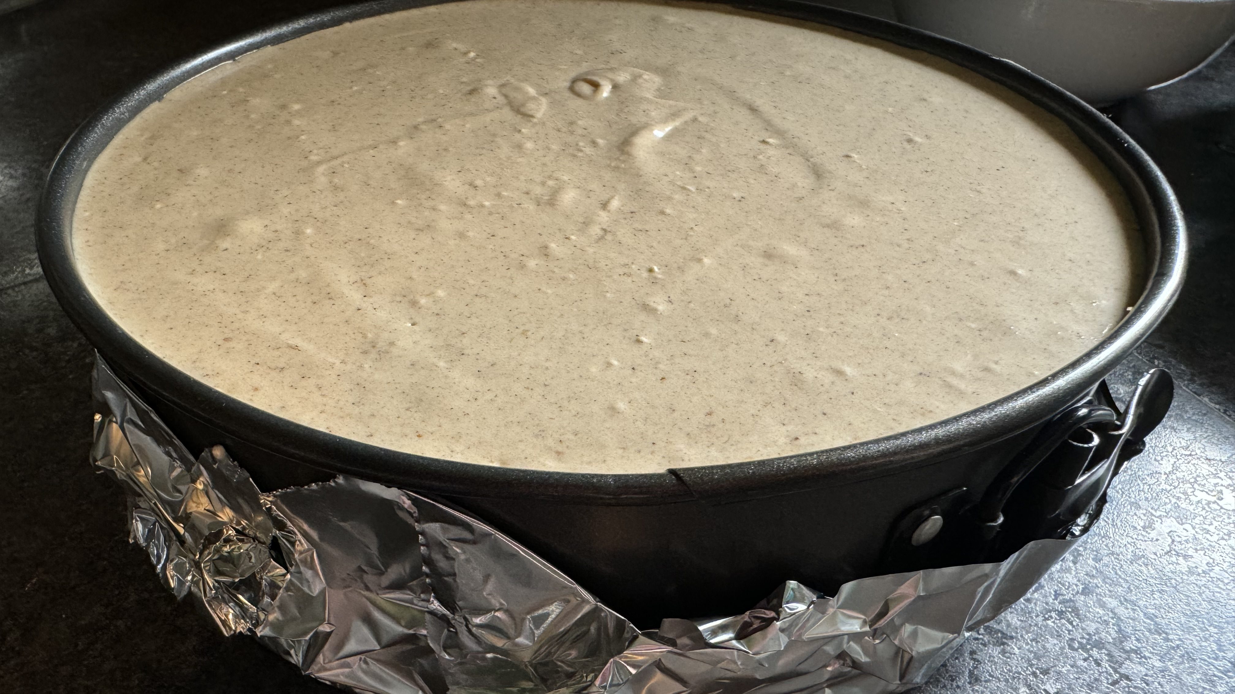 - Grab the spring form pan with the crust and pour the cheesecake mixture into the pan. Wrap the bottom of the pan with aluminum foil.