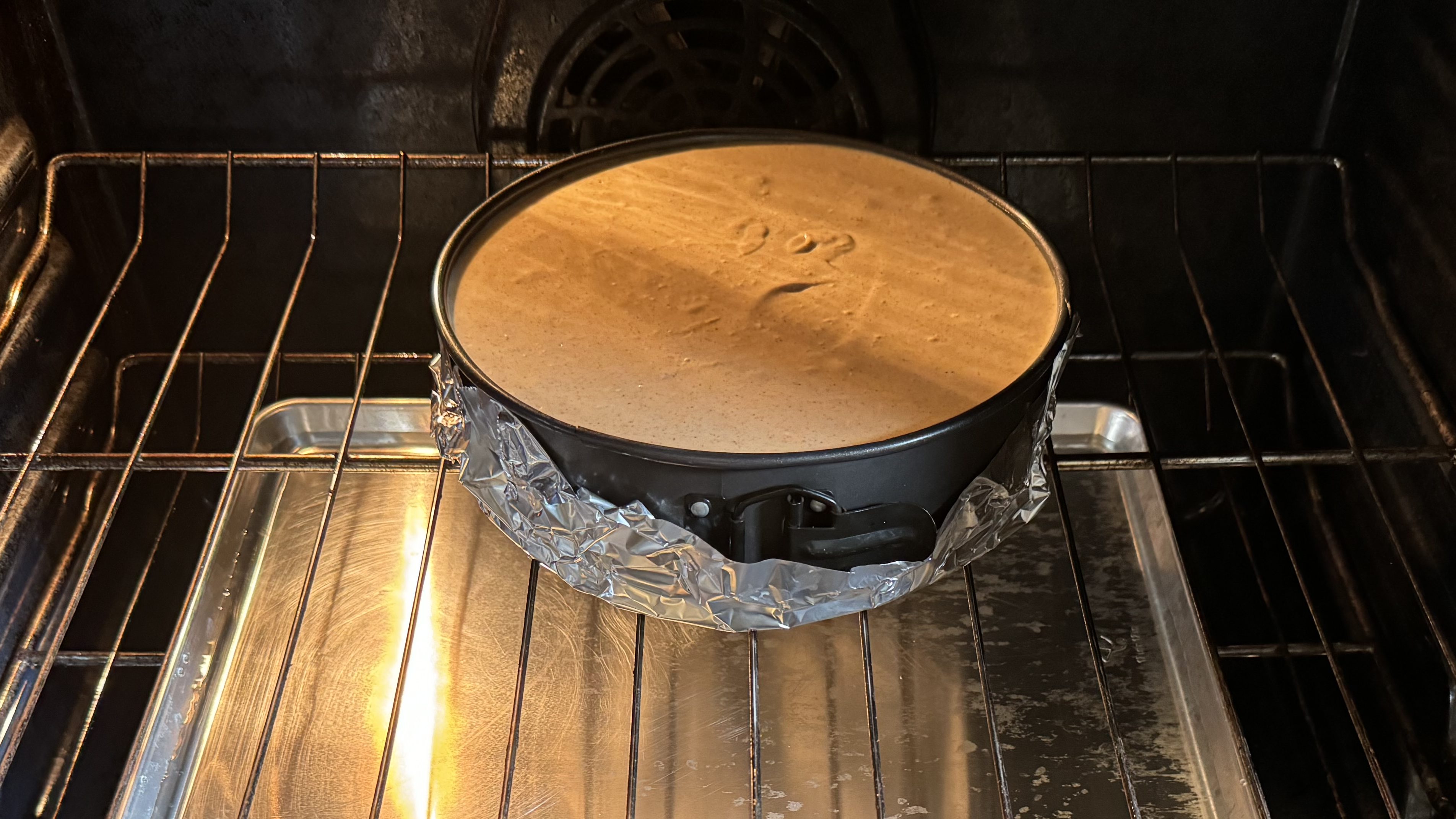 - Adjust the racks in your oven so that you have one rack in the middle, and another below it. Place a baking sheet with around 2″ of water on the lower rack (you can place a smaller sheet pan if needed but will need at least 1″ of water). Place your cheesecake on the middle rack and bake for 50 minutes. This will help prevent your cheesecake from cracking (although if it does crack you can always throw a ton of whipping cream on top and no one will notice).